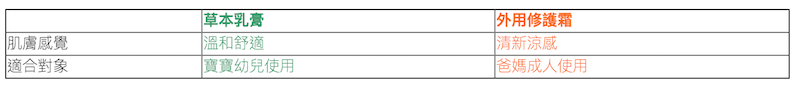 草本乳膏與外用修護霜兩著用途相似,差別在於修護霜添加了「清新薄荷精油」