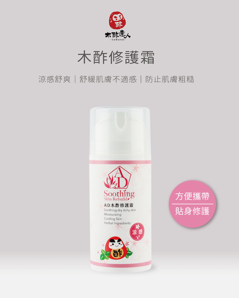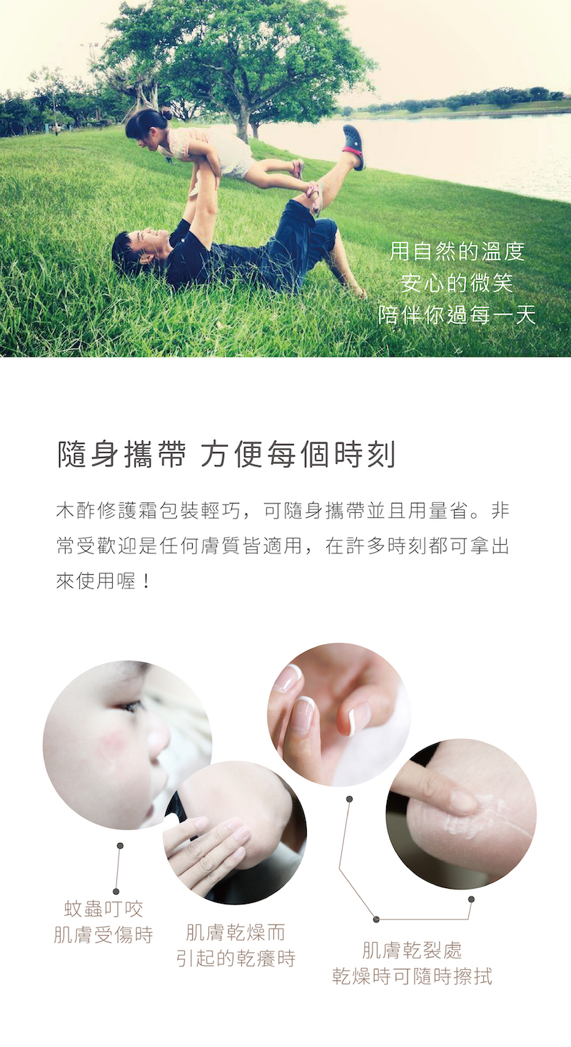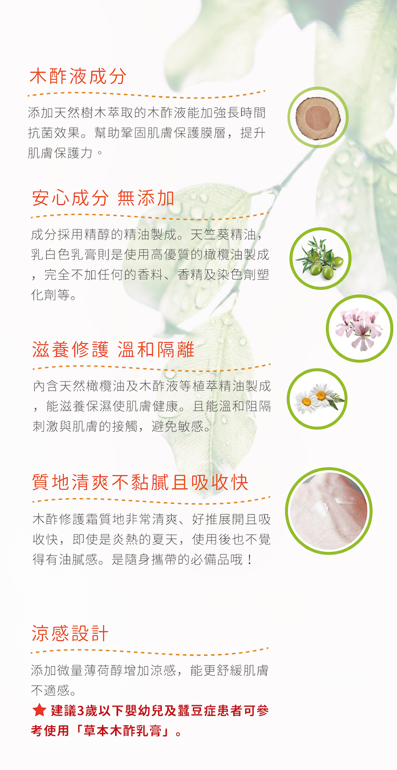 木酢草本乳膏修護霜,使用草本精油搭配木酢原液製作而成,用於肌膚清潔後的保濕與阻隔效果,適合嬰幼兒至成人的肌膚照顧,非常溫和且具保濕效果,可無負擔的完成肌膚照顧。